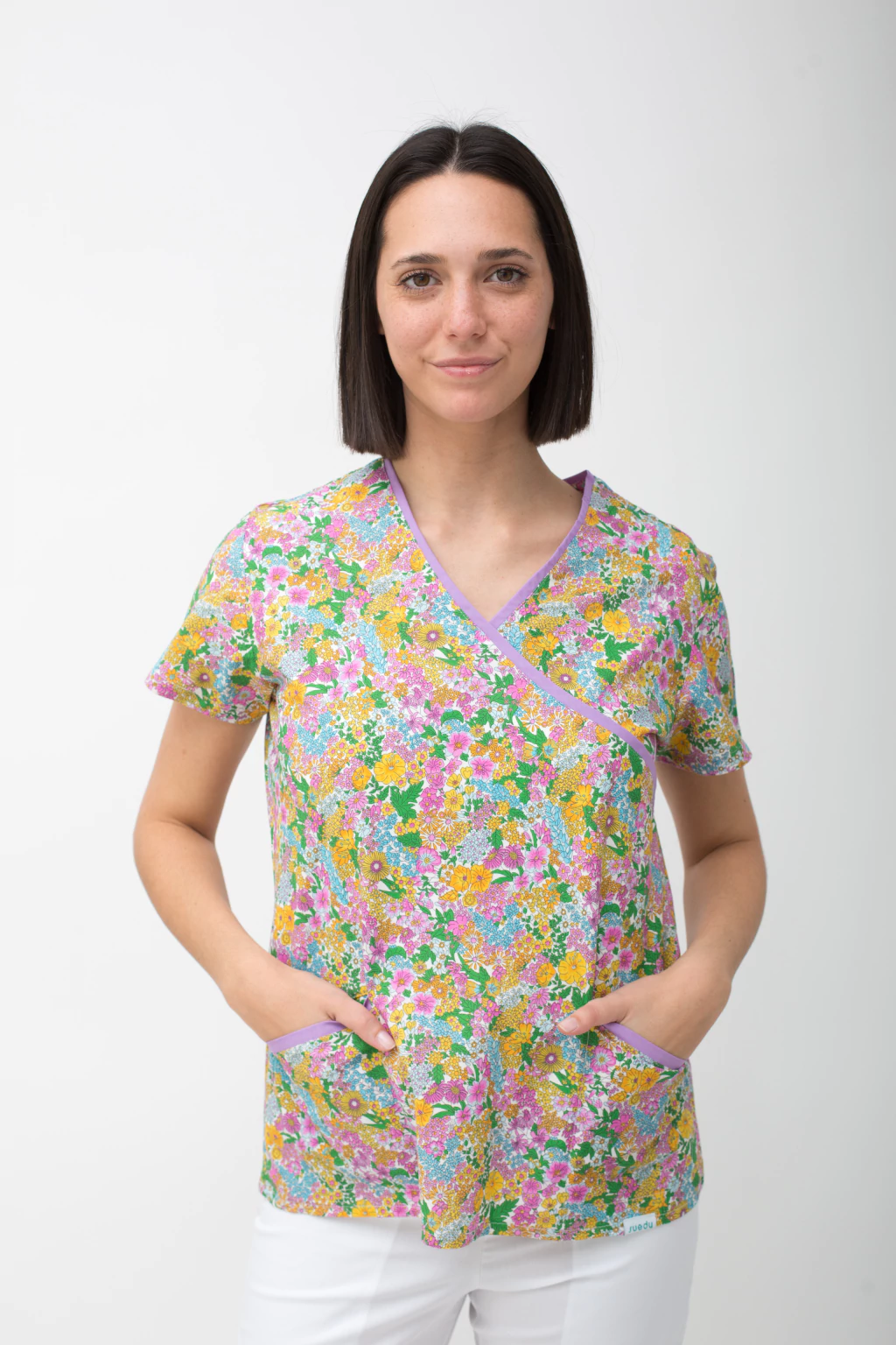 Casaca escote v cruzada, 2 bolsillos con vivos combinados, manga corta.